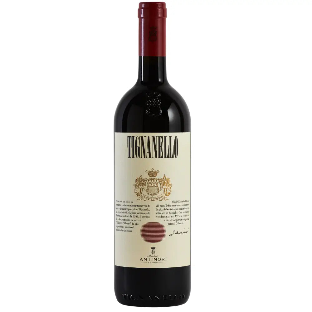Tignanello is a deep ruby red color. Its nose offers exceptional complexity with notes of red fruits, strawberries and pomegranate that give rise to delicate aromas of apricots and peaches in syrup accompanied by elegant sensations of vanilla, dried flowers, chocolate, and pleasant spicy sensations of nutmeg. Its bouquet is completed by notes of coffee, caramel, and aromatic Mediterranean herbs. A graceful and mouth filling palate presents silky, vibrant tannins and imparts liveliness, sapidity and a lengthy flavor profile. The aftertaste is characterized by notes of roasted coffee and bitter chocolate.
